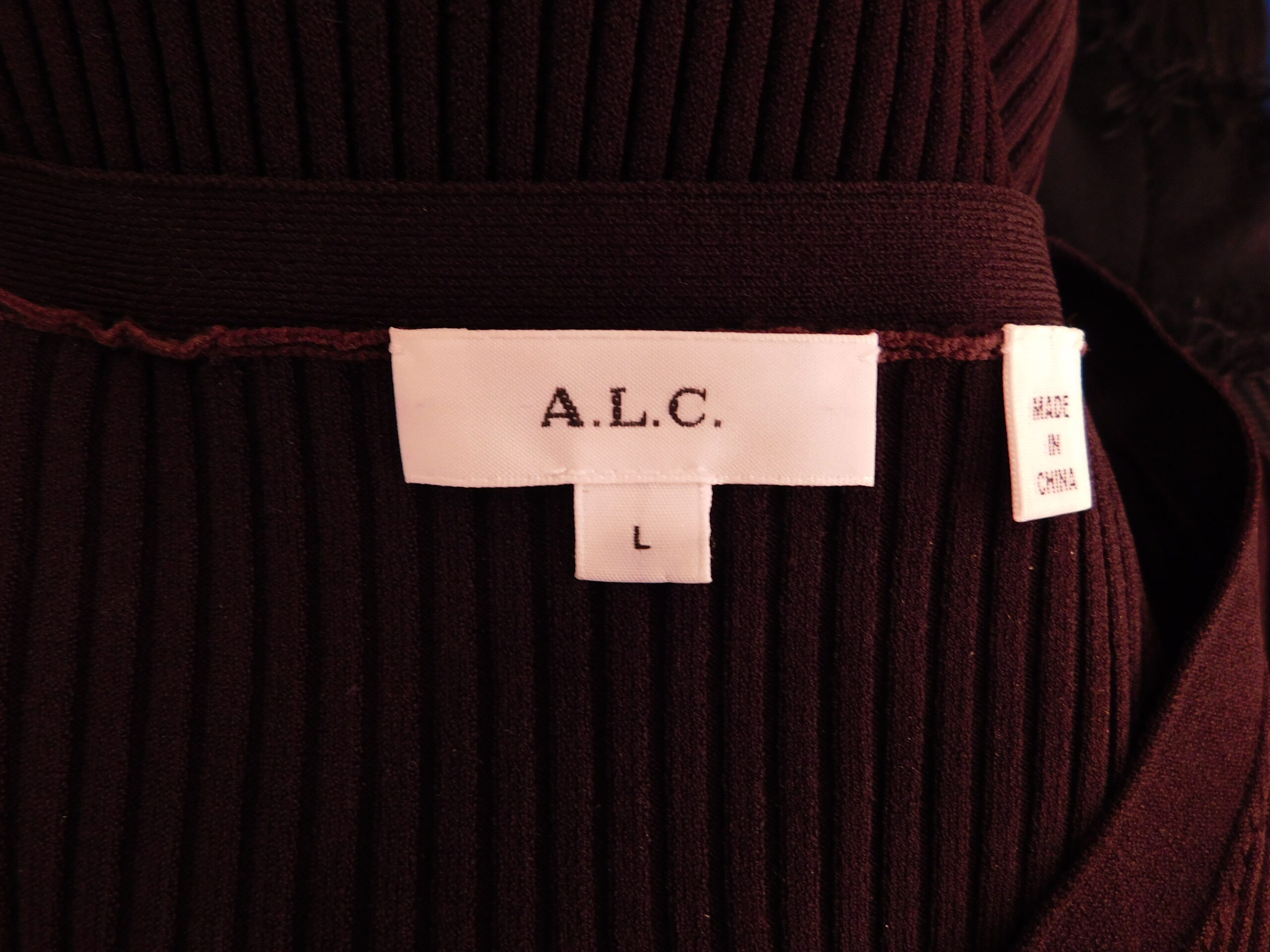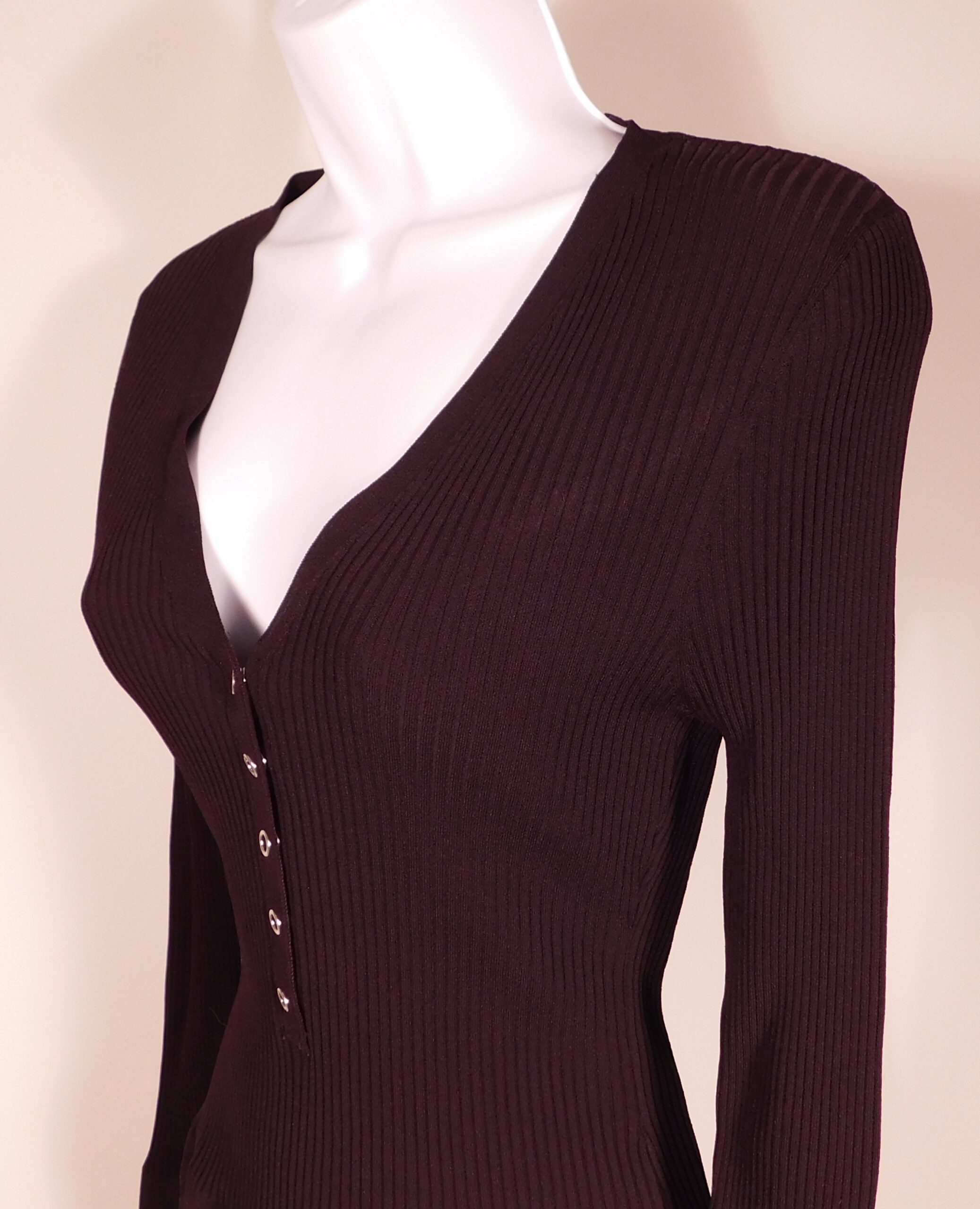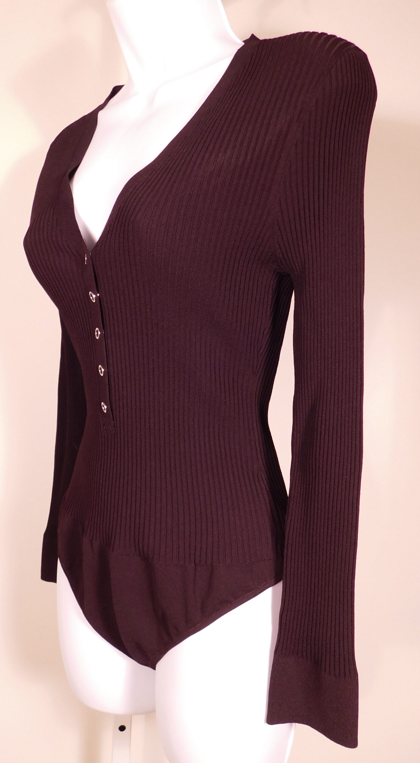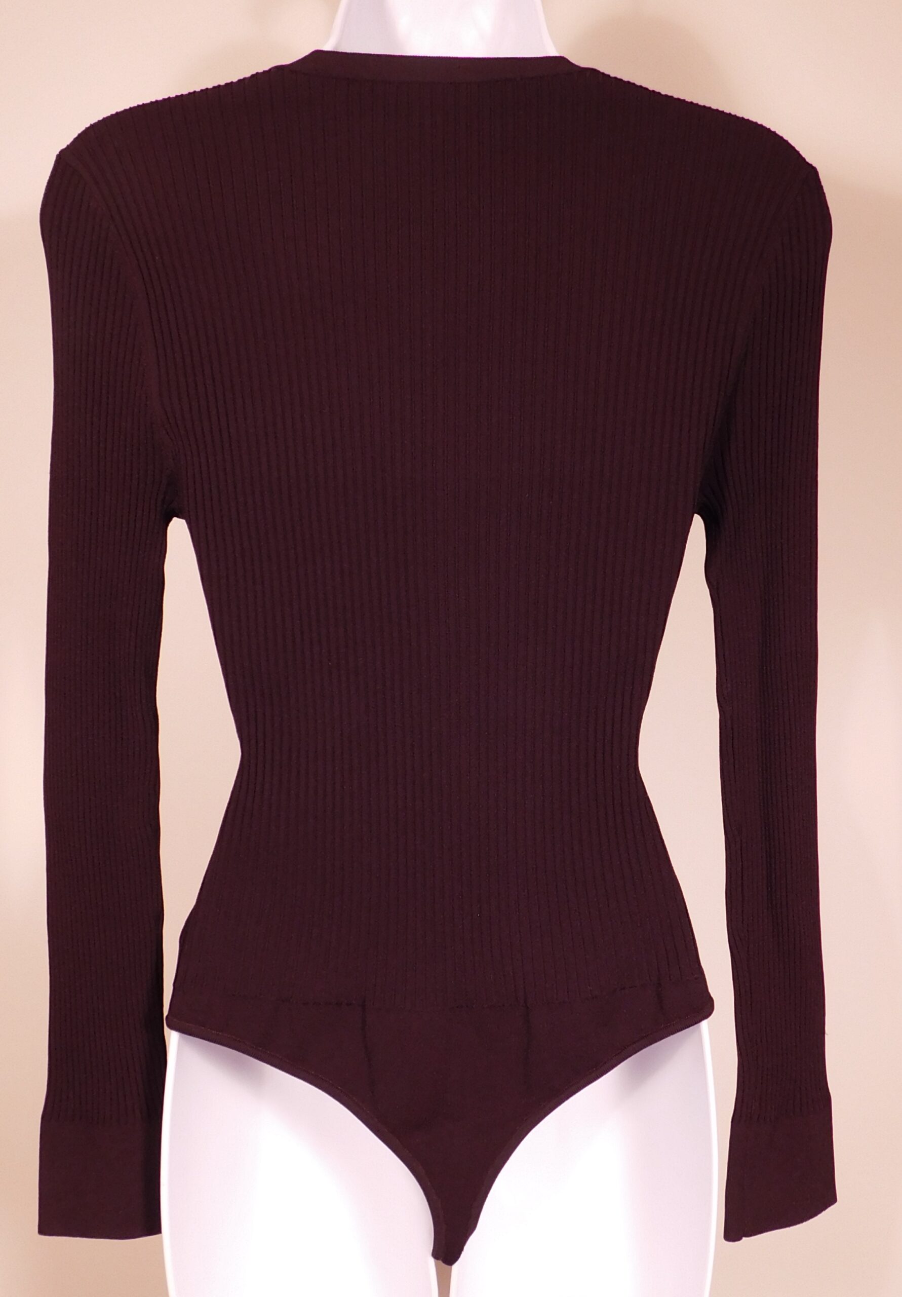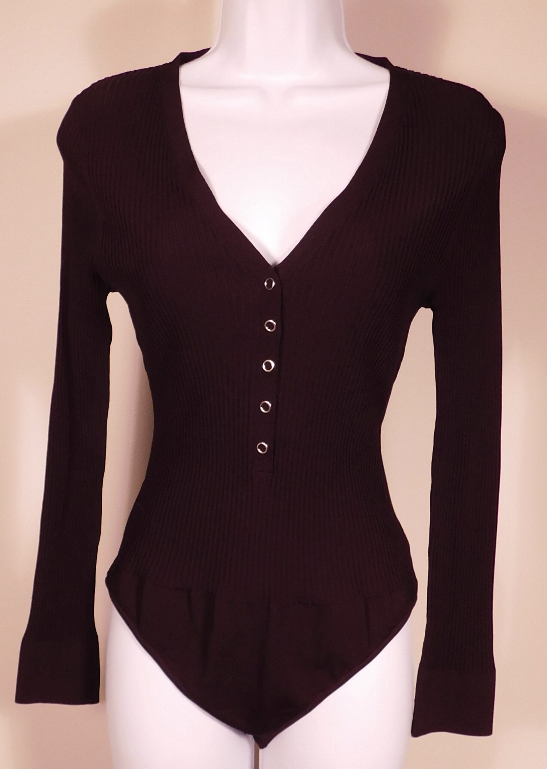 A.L.C. Women’s Brown Ribbed Knit Snap Front V- Neck Long Sleeve Body Suit Blouse Sz L