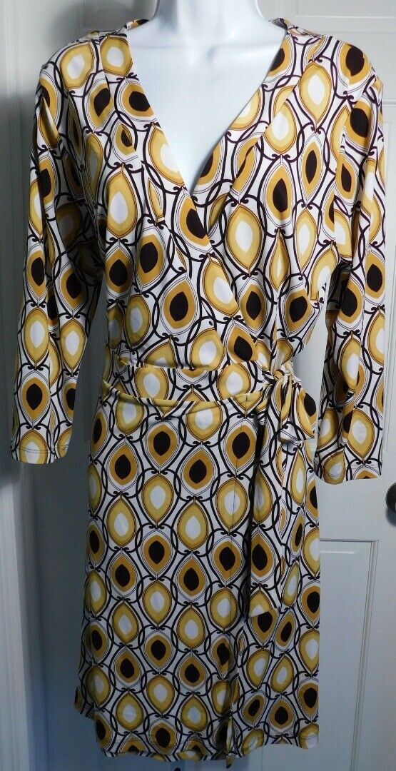 BROOKE RODD NWT Women’s Ivory Brown Gold Jersey Knit 3/4 Sleeve Wrap Dress Sz L