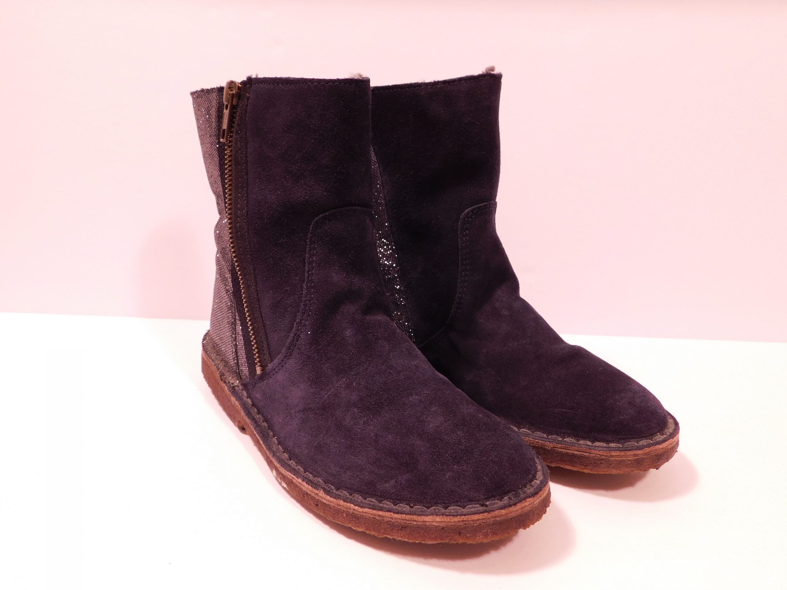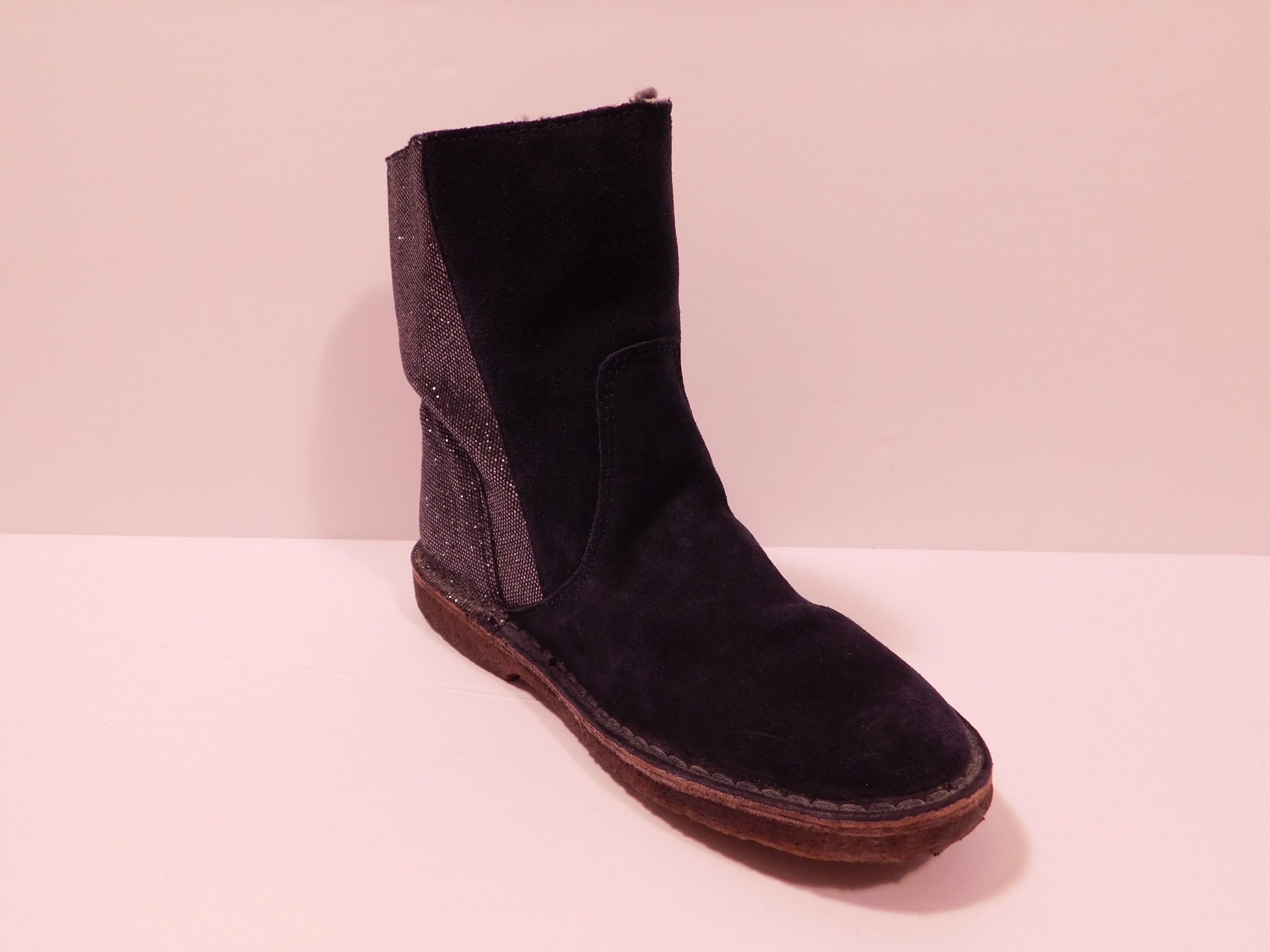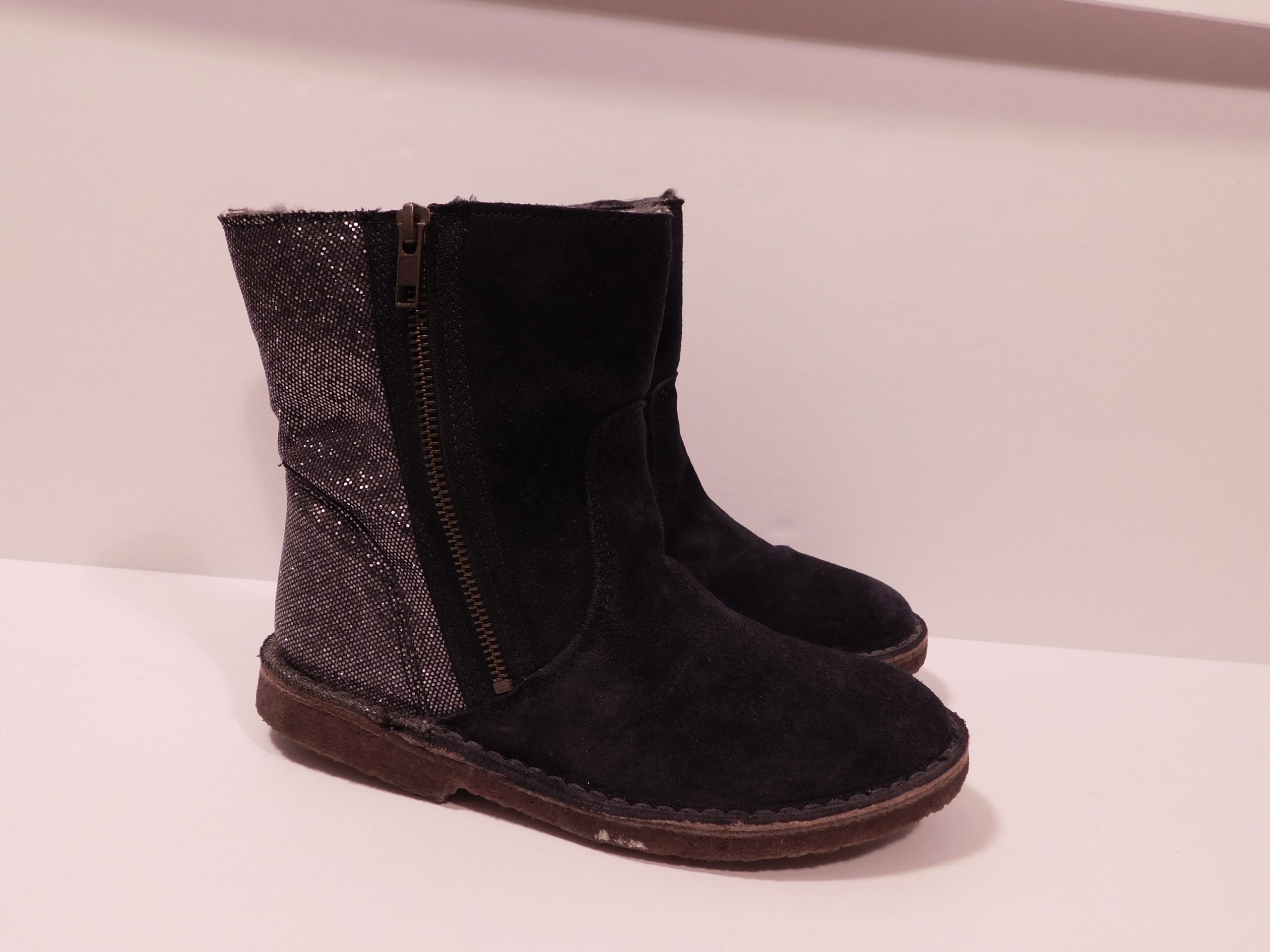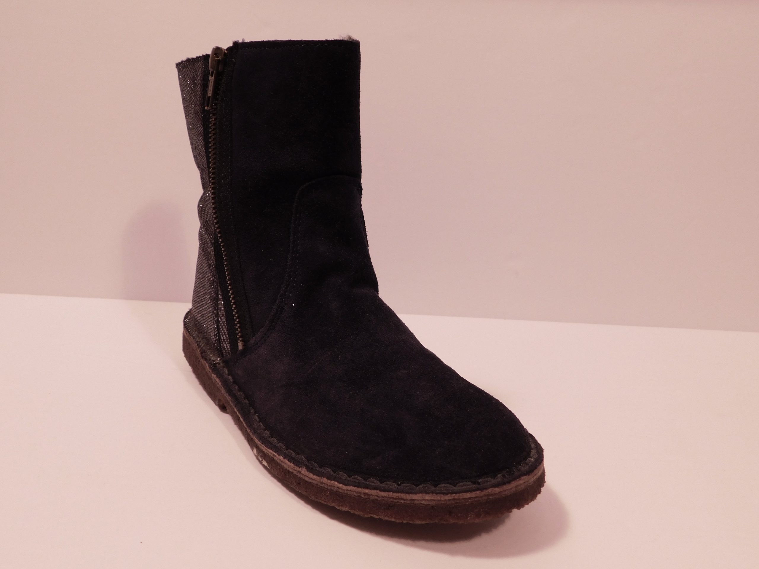 Crewcuts ‘Zip chalet boots with glitter. Navy dyed lamb leather with shearling lining and side zip.