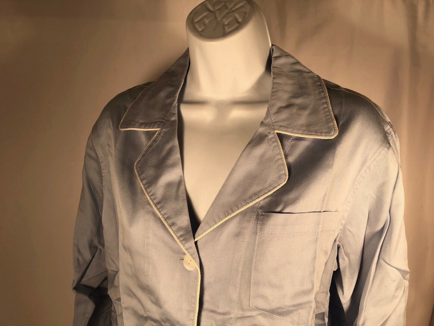 Delicate cream-colored piping accents the collar and cuffs.