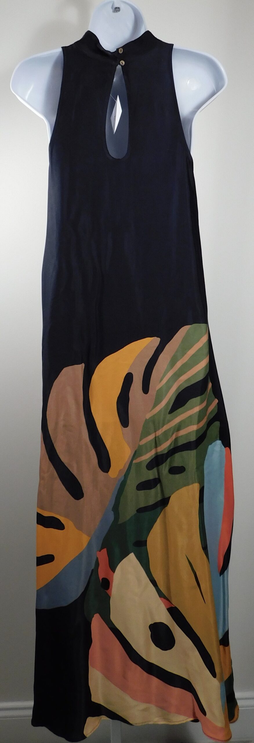 FARM RIO FOR ANTHROPOLOGIE Women’s Black Floral Sleeveless High Neck Maxi Halter Dress Sz XS