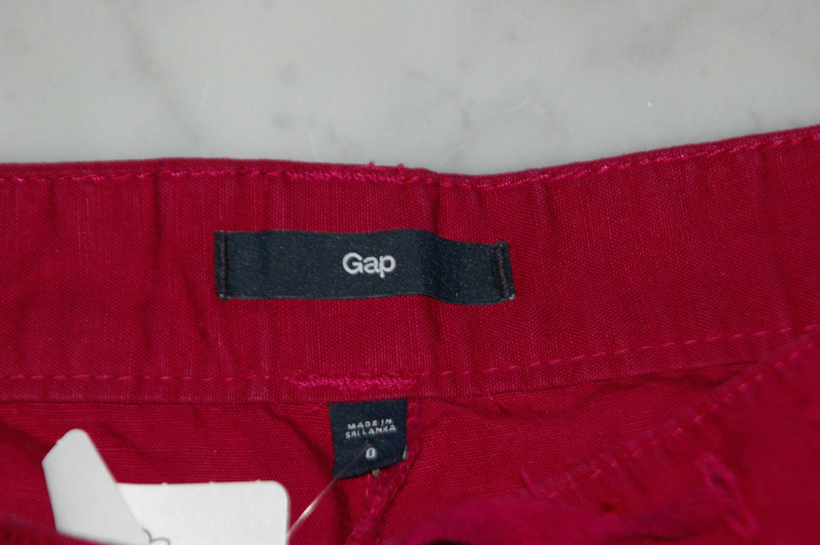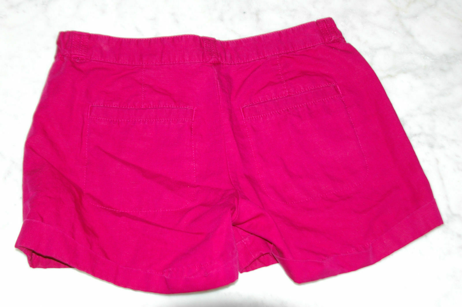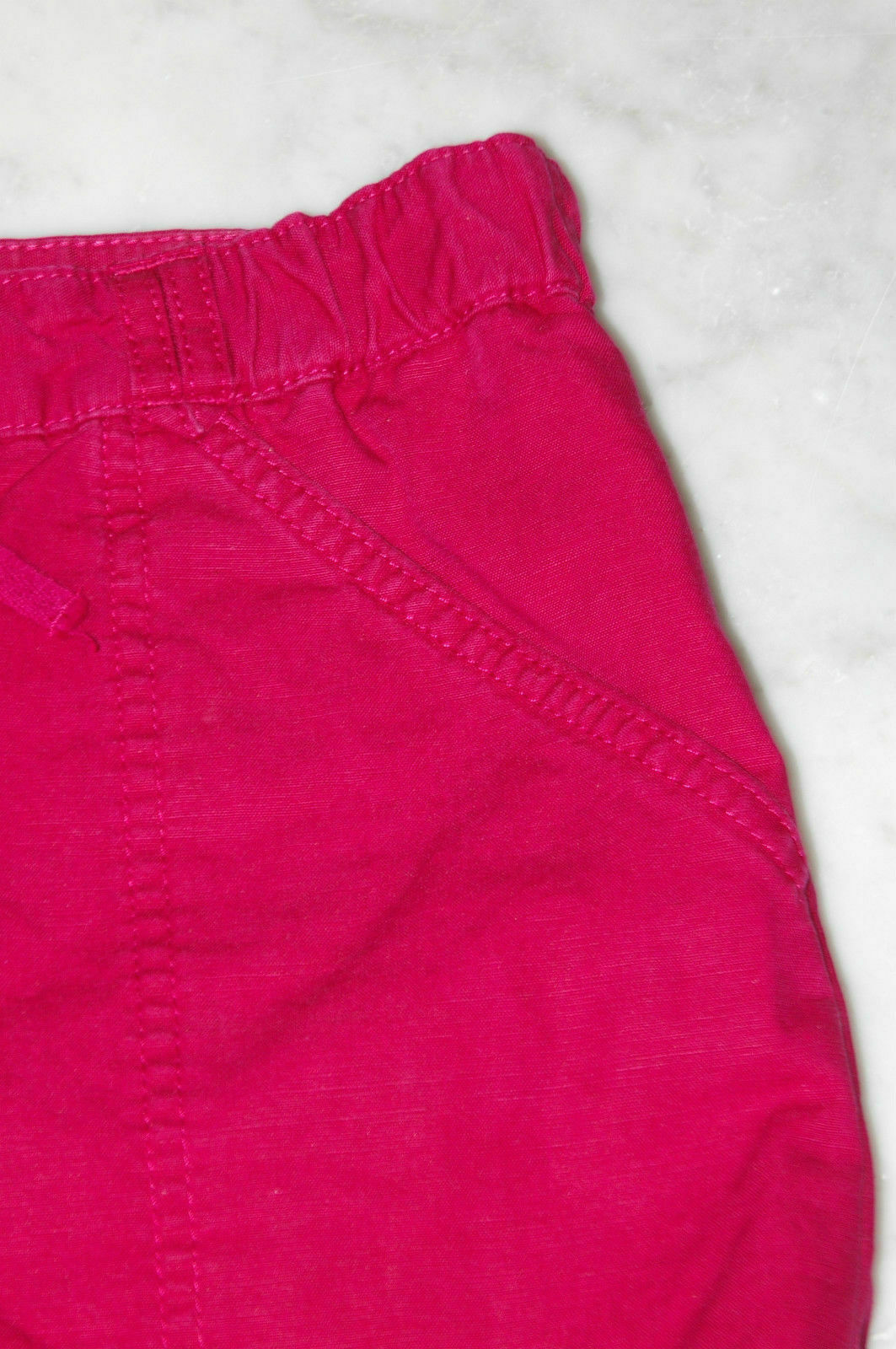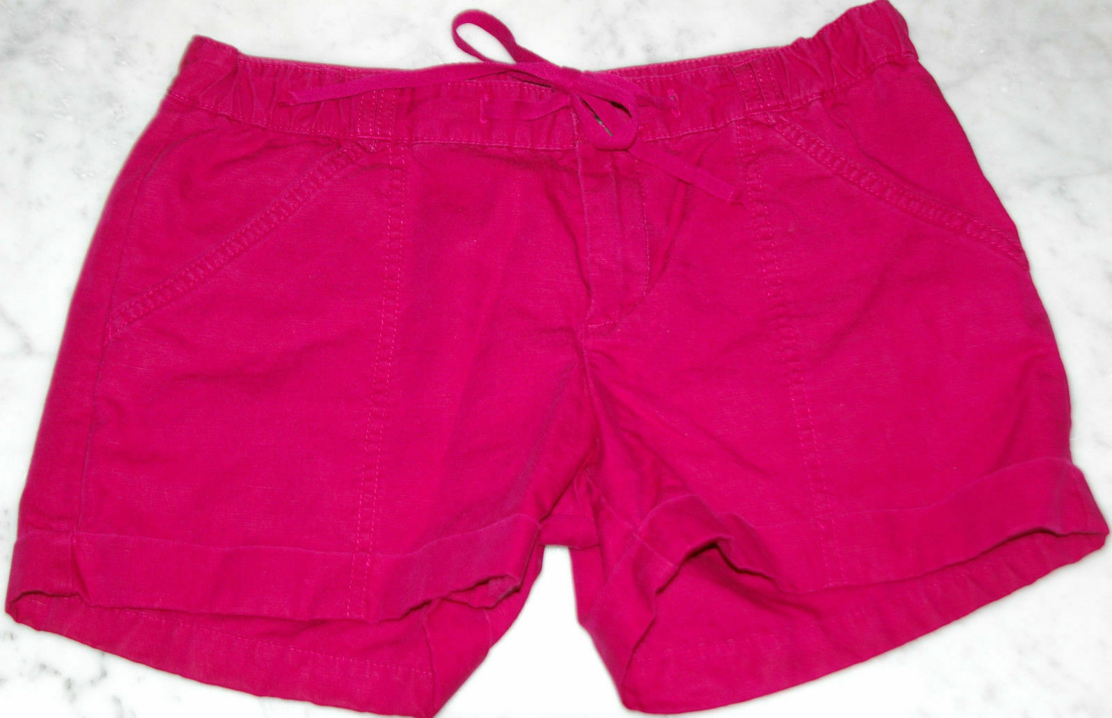 GAP cotton/linen women’s short, size 0 in cranberry red color. Flat front, front flat pocket, drawstring, single roll hem waist – 15″ hips – 19.75″ inseam – 3″ rise – 9″ leg opening – 11.5″