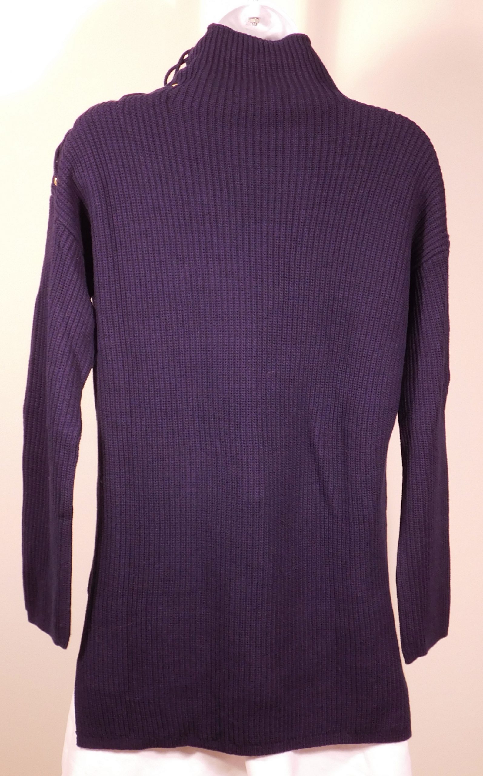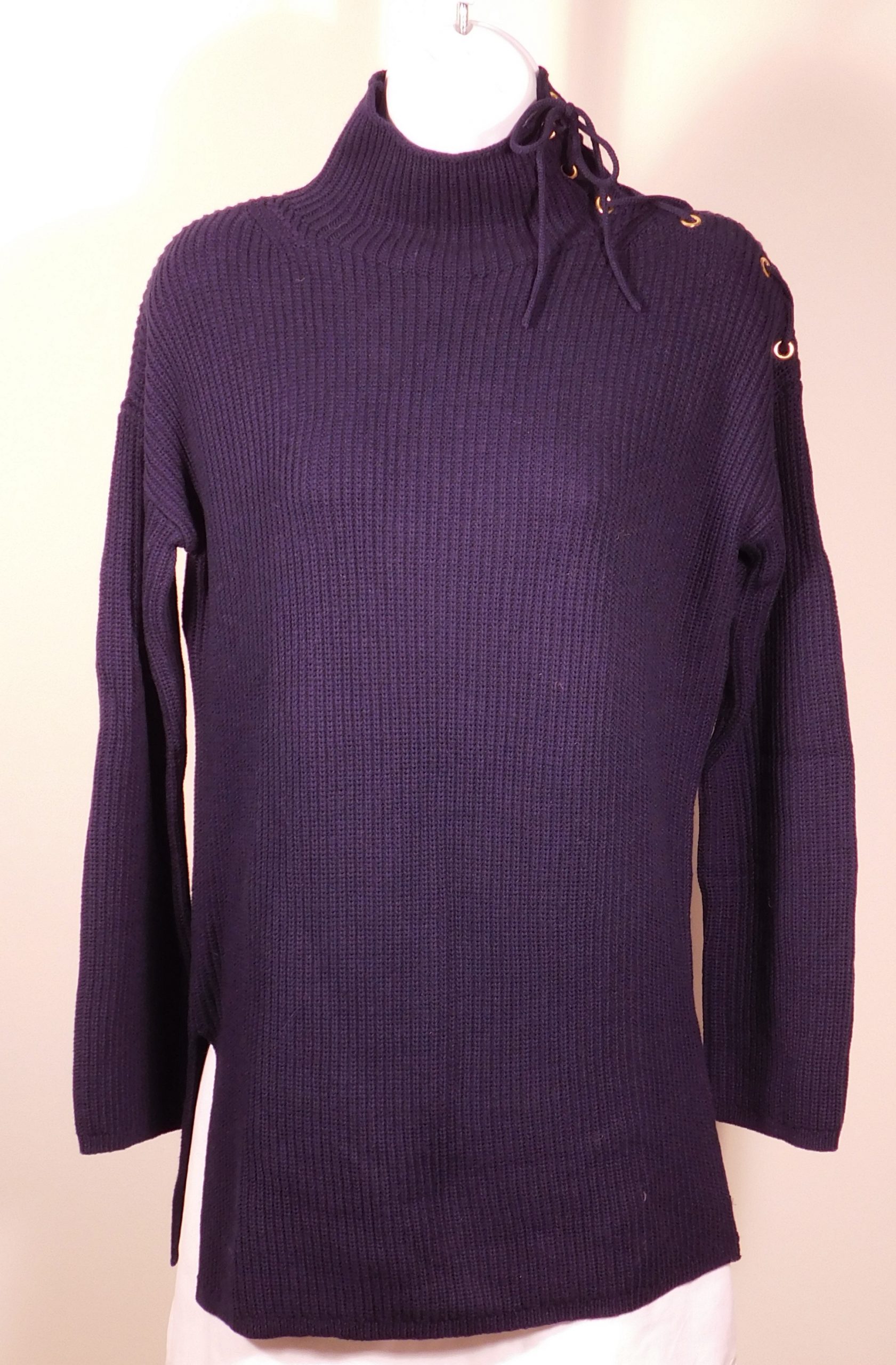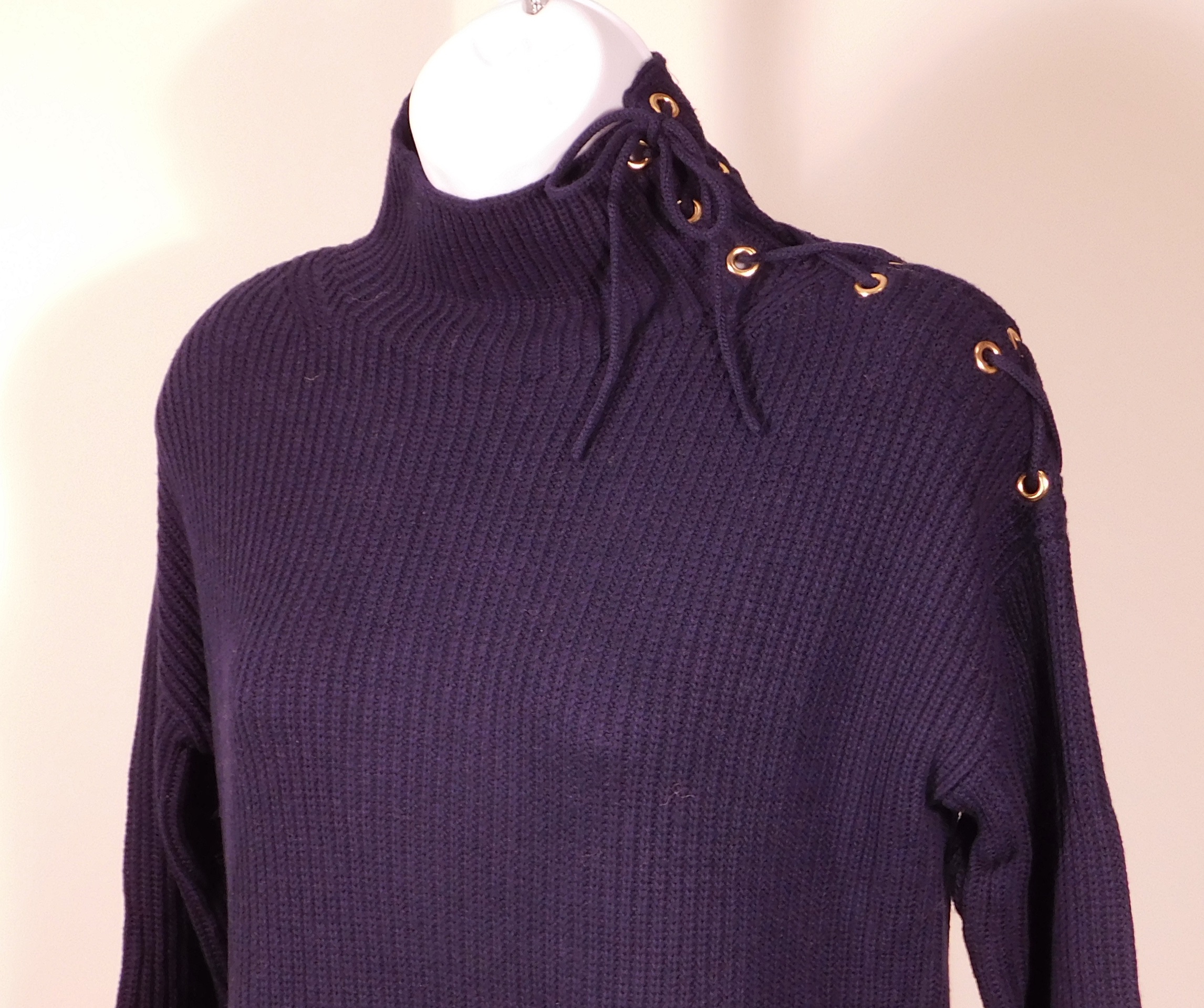 J CREW Women’s Navy Blue Cotton Blend Ribbed High Neck Laced Shoulder Tunic Sweater Sz XS