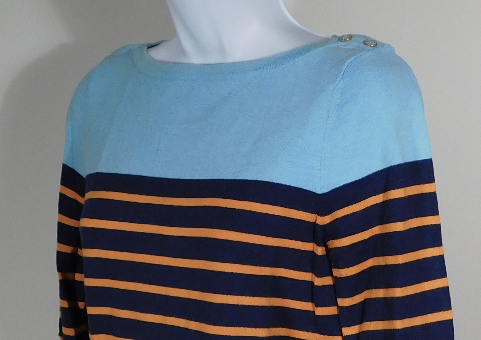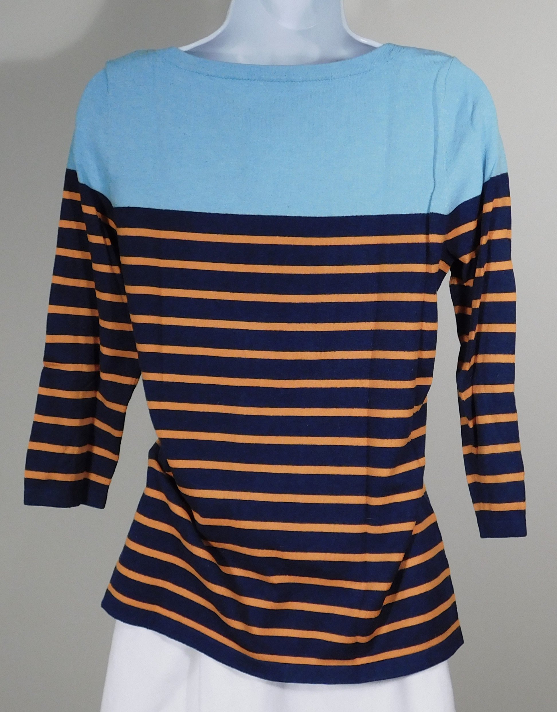 J MCLAUGHLIN Women’s Blue & Orange Stripe W Light Blue Shoulder Cotton Blend Boat Neck Flat Knit 3/4 Sleeve Tunic Sweater Sz S