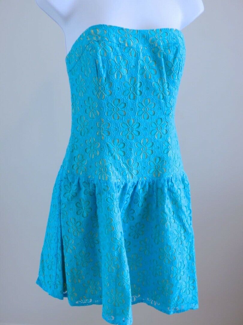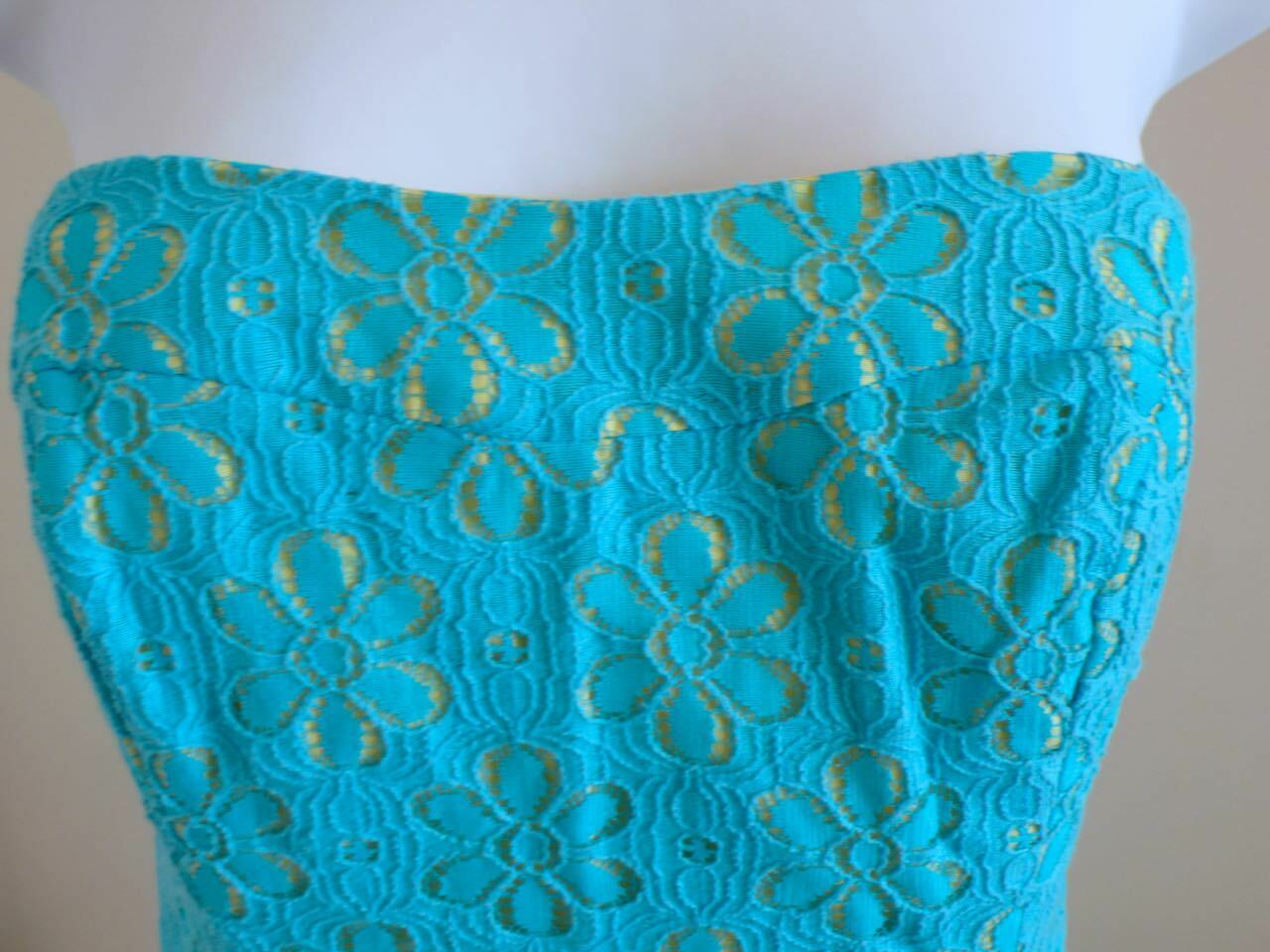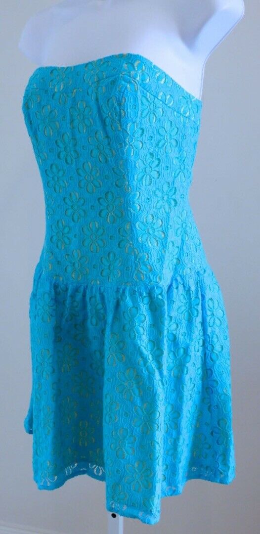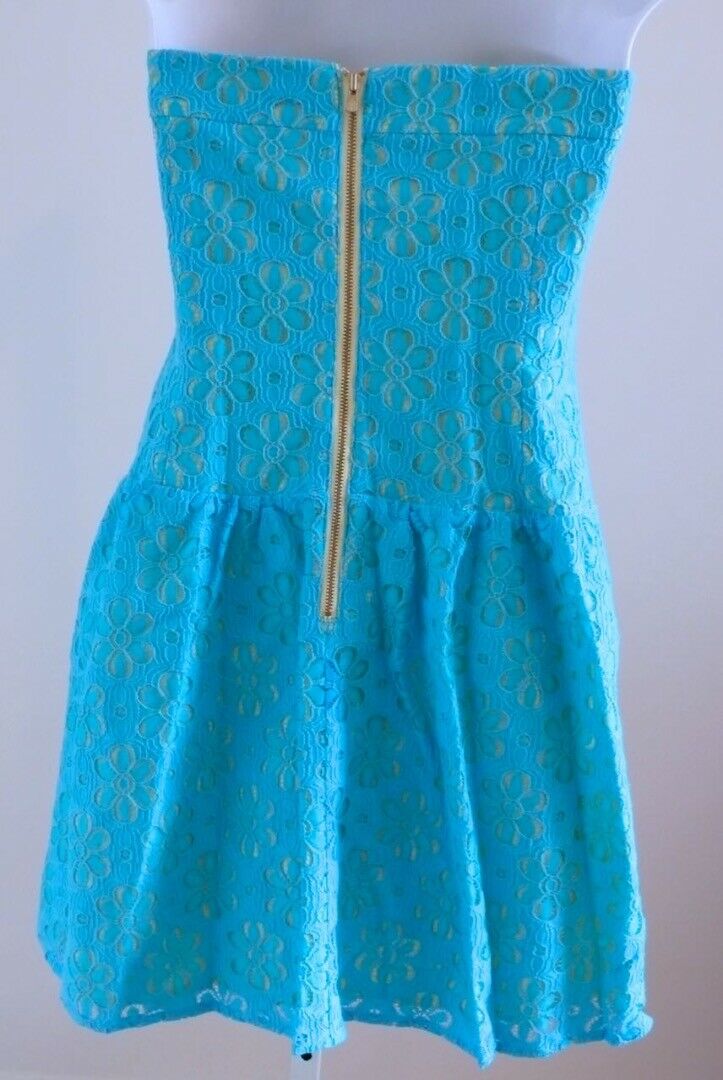 LILLY PULITZER Turquoise Floral Lace Overlay & Yellow Lined Strapless Dress Sz 4