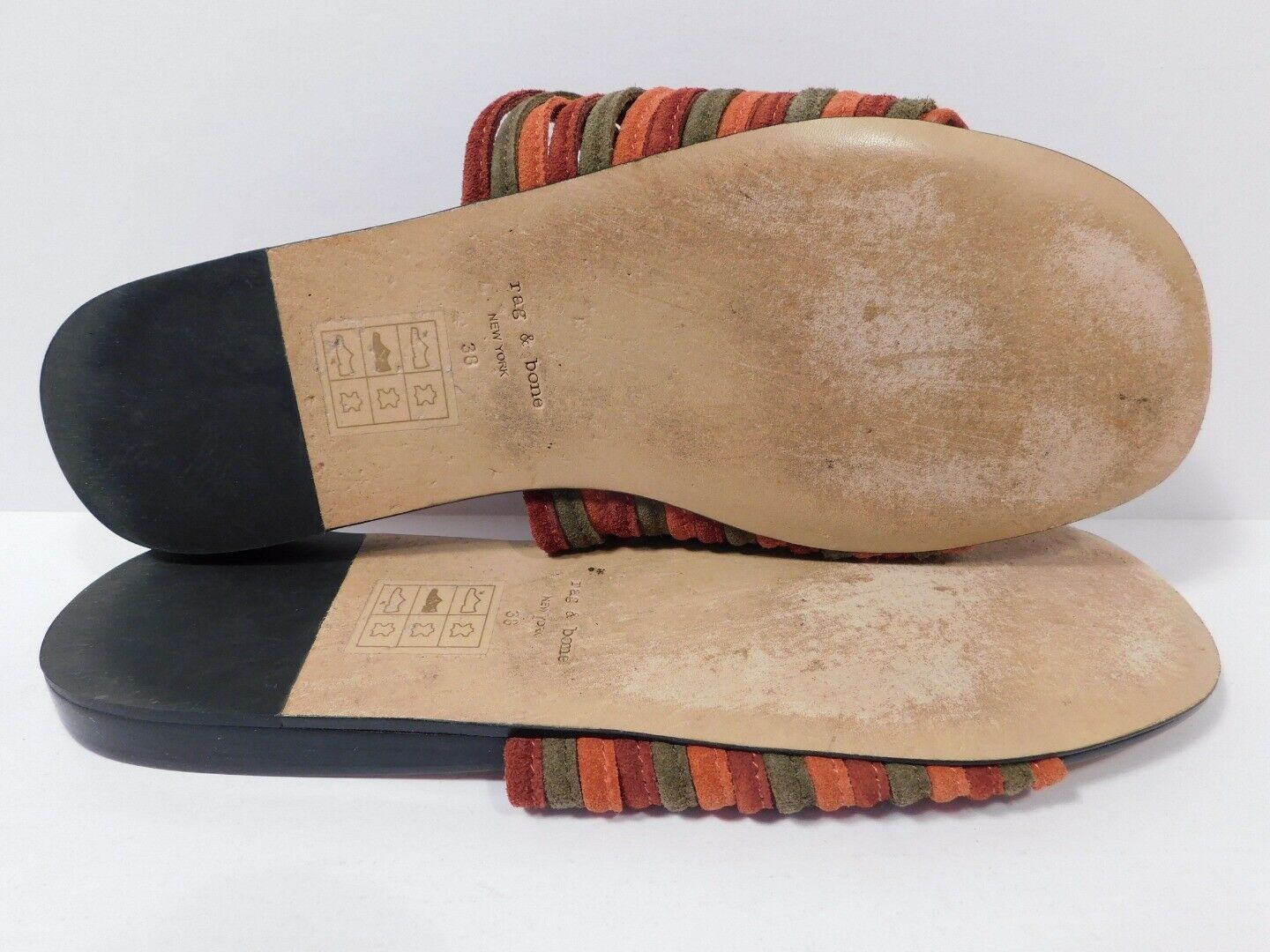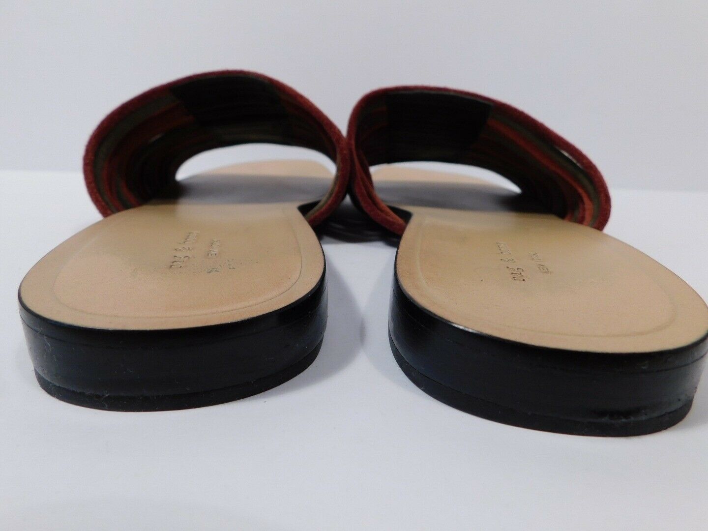 Pink suede Rag & Bone Cameron slide sandals with multistraps at vamps and stacked heels.