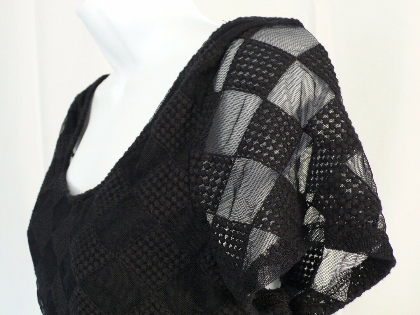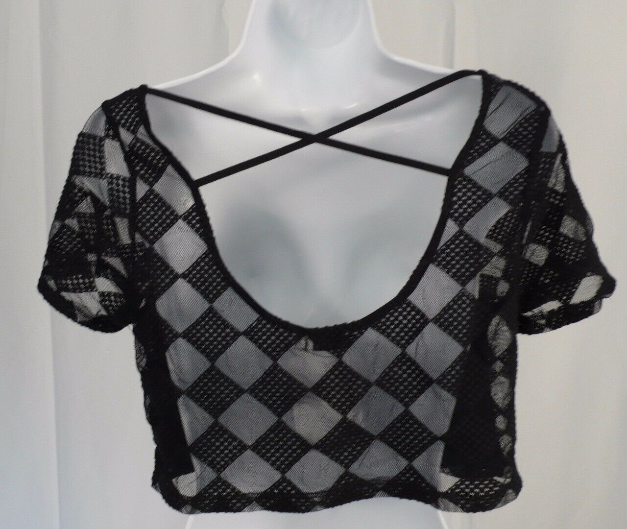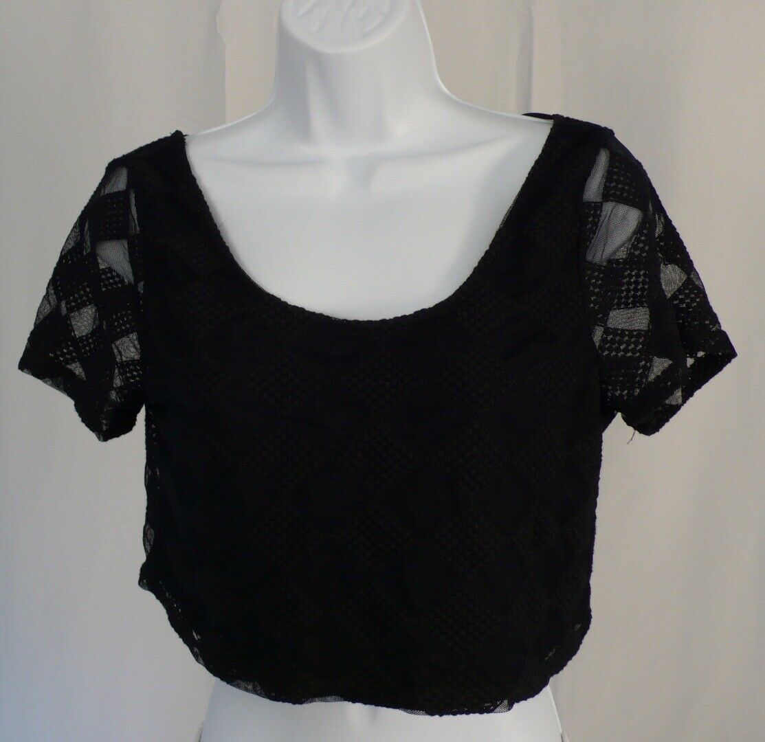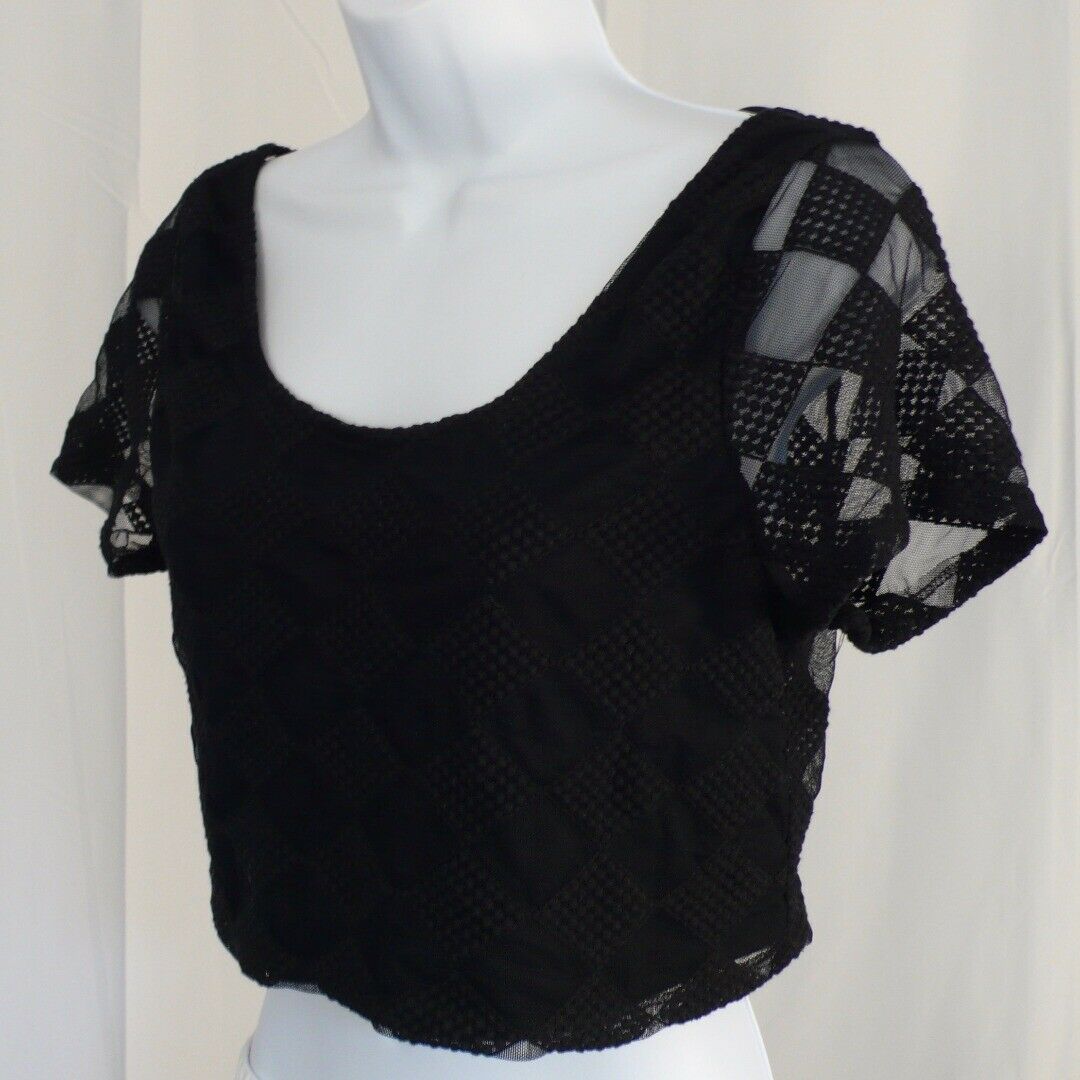 TOBI Women’s Midnight Blue Diamond Mesh Overlay Scoop Back Cropped Blouse Sz S
