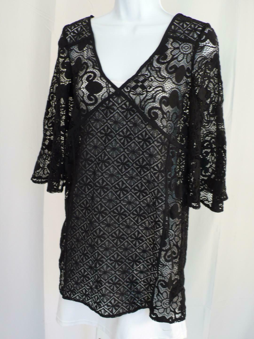 TOP SHOP Women’s Black Lace V-Neck 3/4 Sleeve Beach Cover Up Tunic Dress Sz S