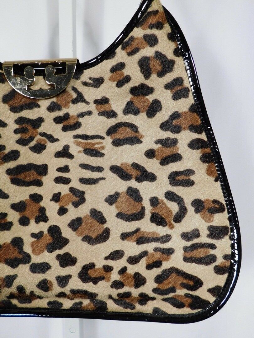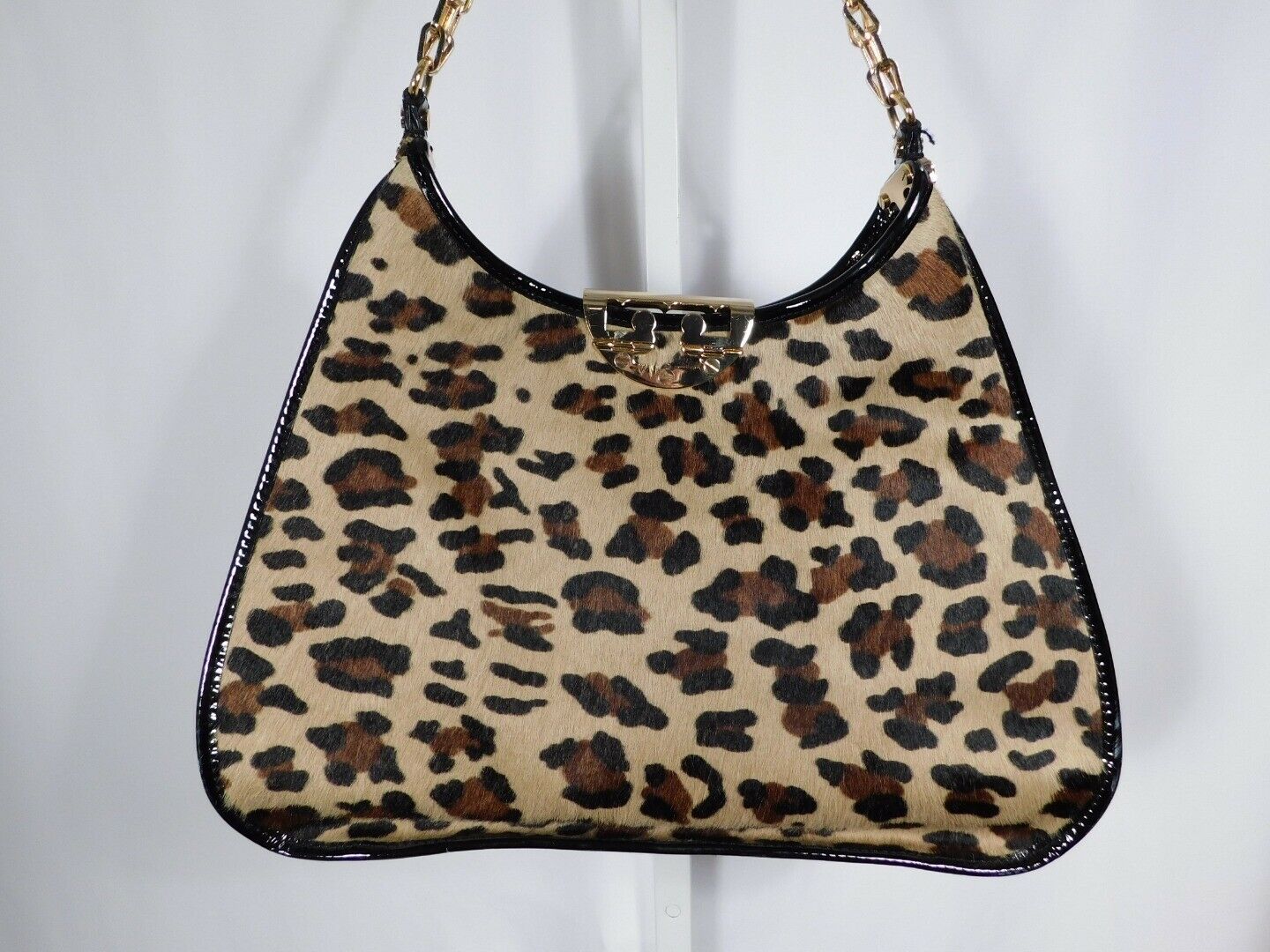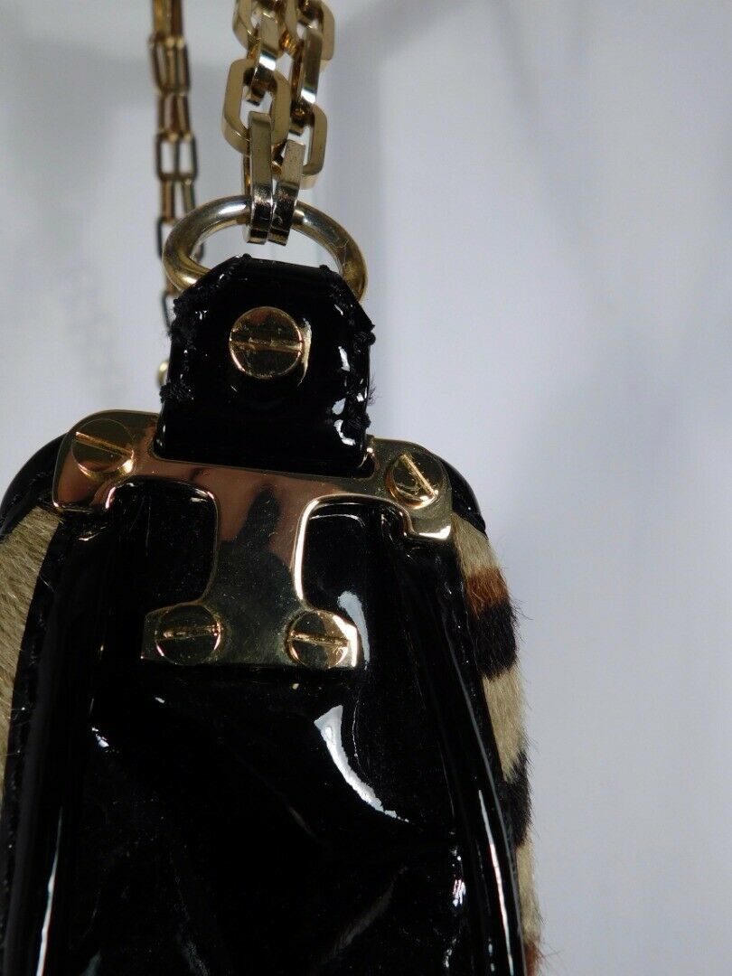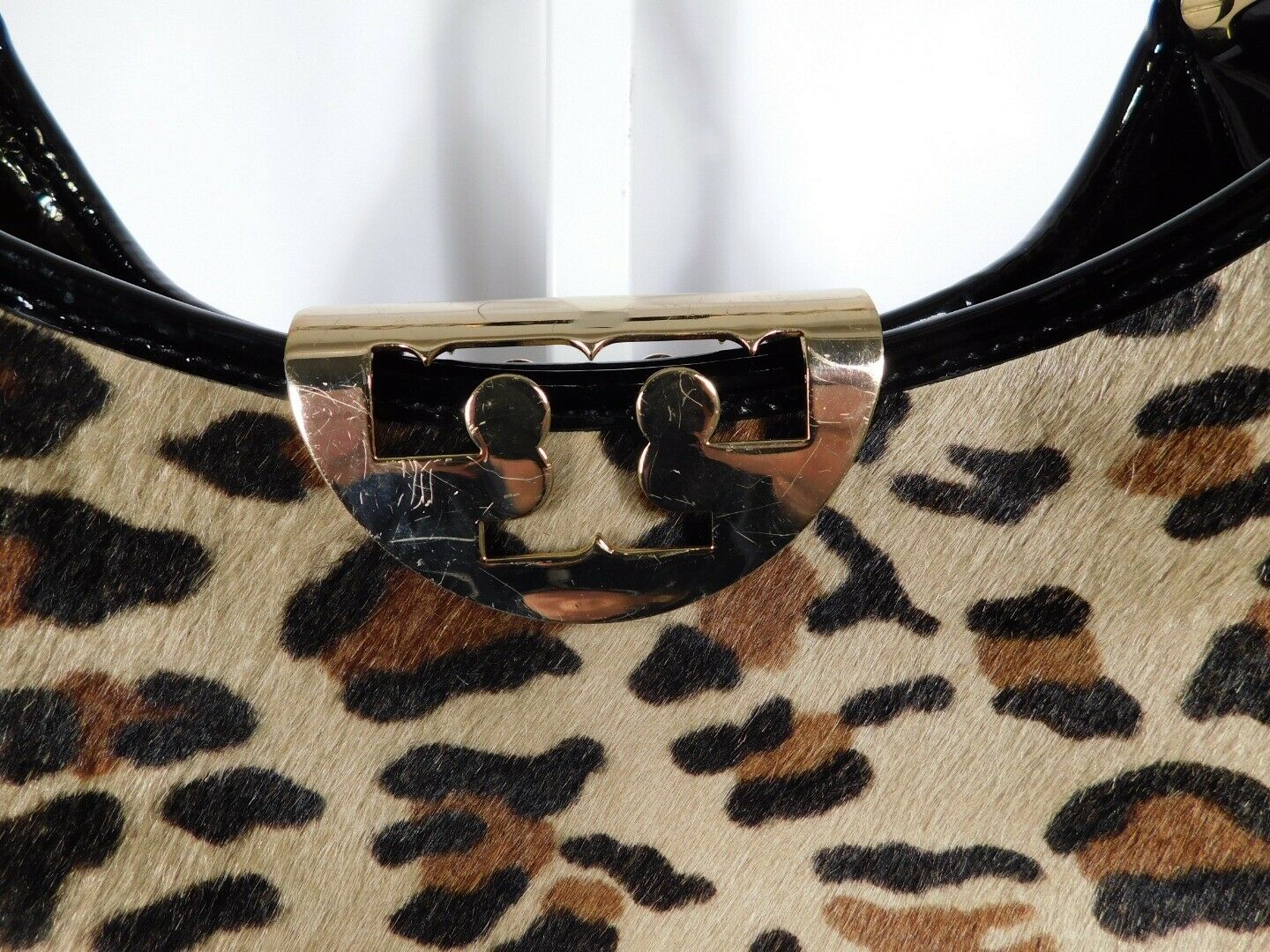 TORY BURCH Cheetah Print Patent Leather Trim Pony Hair Gold Chain Tote Handbag