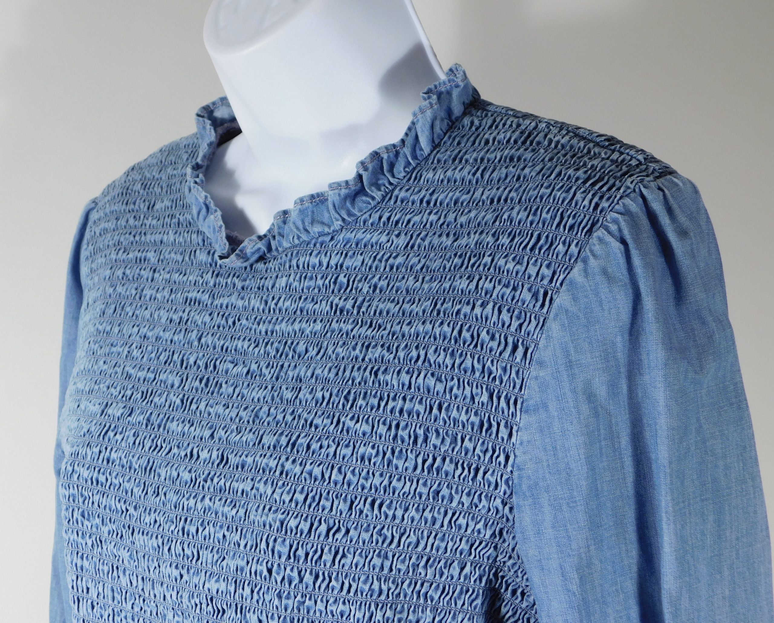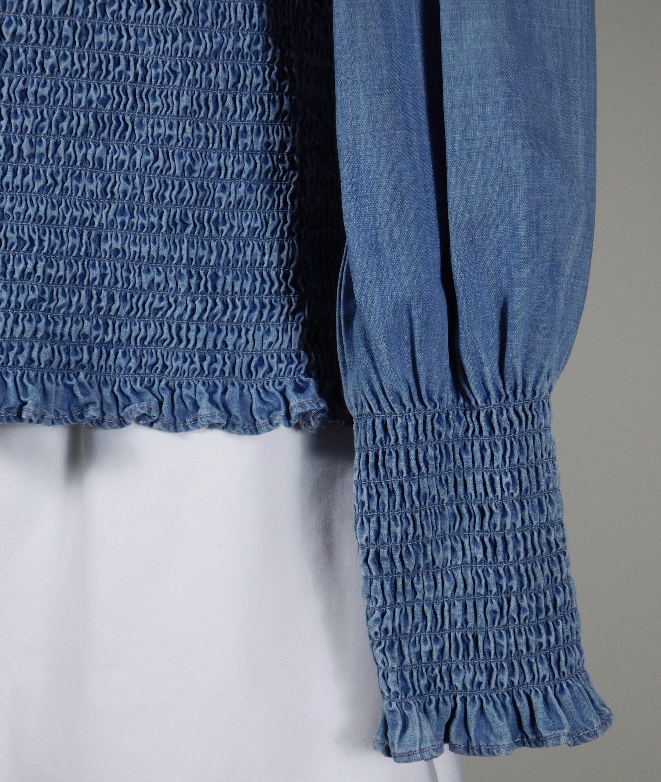Smocked Idony top in chambray features puffed sleeves and a cool, lived-in look. Ruffled trims complete this feminine yet relaxed style. Pair it back to any of our dark-wash jeans or try it with a flowy midi skirt for date-night chic.